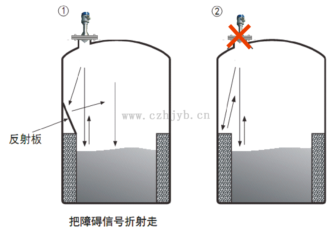 Ø 當(dāng)罐中有障礙物影響測量時(shí),要加裝反射板才能正常測量。
